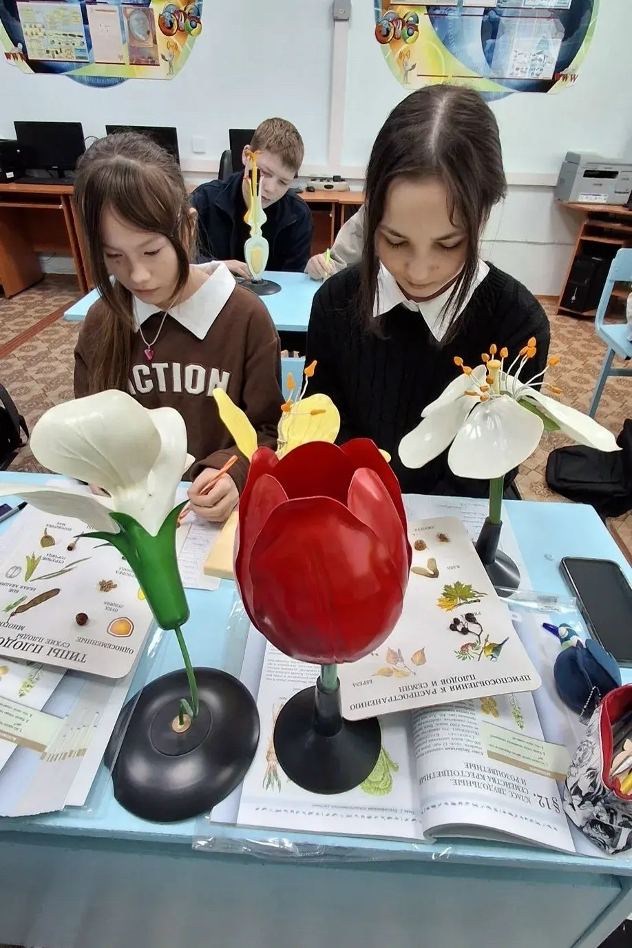 На этот раз объектом изучения ребят стало строение цветка растений семейств Однодольные и Двудольные. То, что раньше приходилось разбирать только по картинкам в учебнике, теперь можно увидеть в деталях своими глазами на примере макетов.
