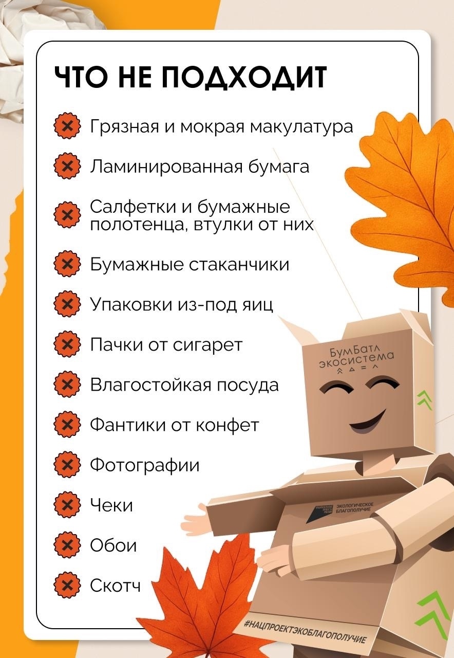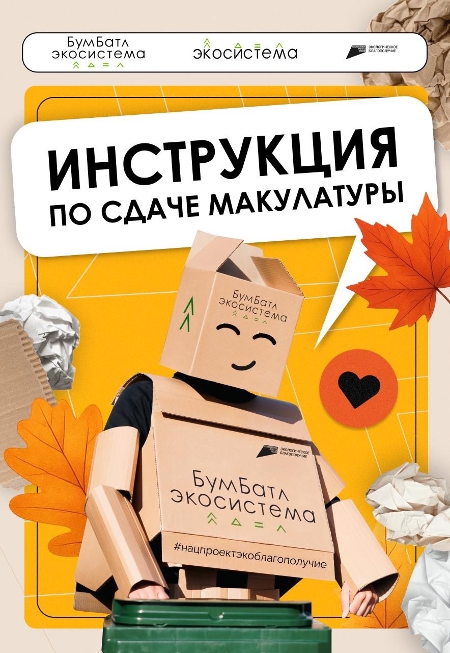 Присоединяйтесь к акции в поддержку нацпроекта «Экологическое благополучие» и на сайте бумбатл.рф узнавайте, где находятся ближайшие пункты приёма макулатуры.