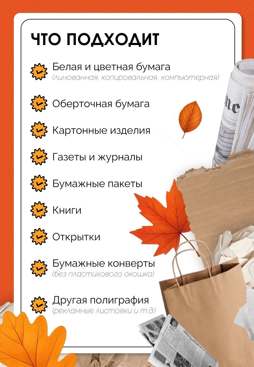 Газеты, книги, открытки, бумажные конверты — и это только начало! Чтобы не ошибиться, мы подготовили удобные карточки-инструкции, где подробно рассказано, какие материалы принимают. Но помните: каждый пункт приёма макулатуры может иметь свои правила, так что уточняйте детали в своём городе.
