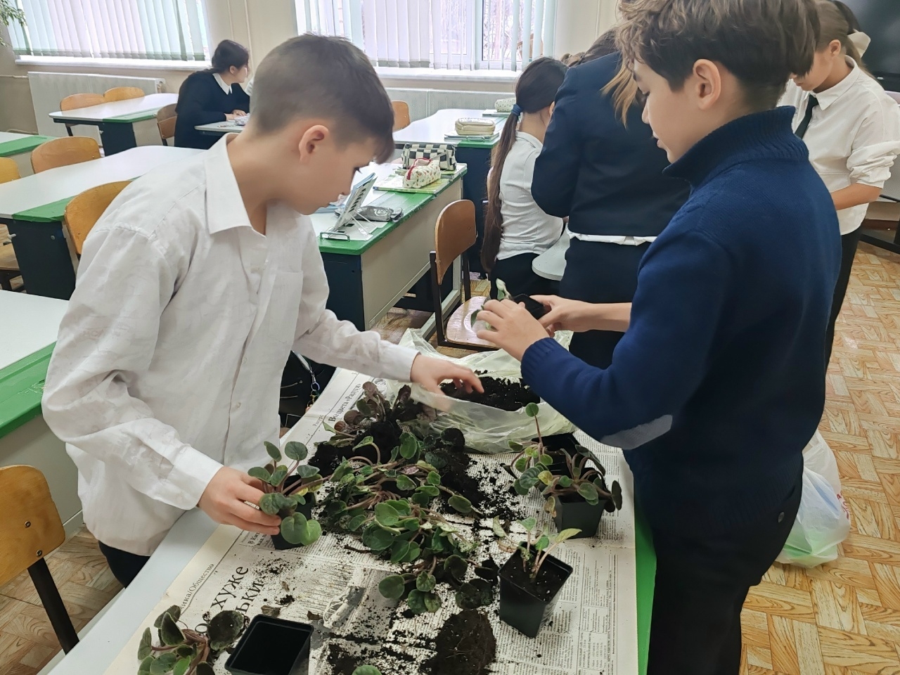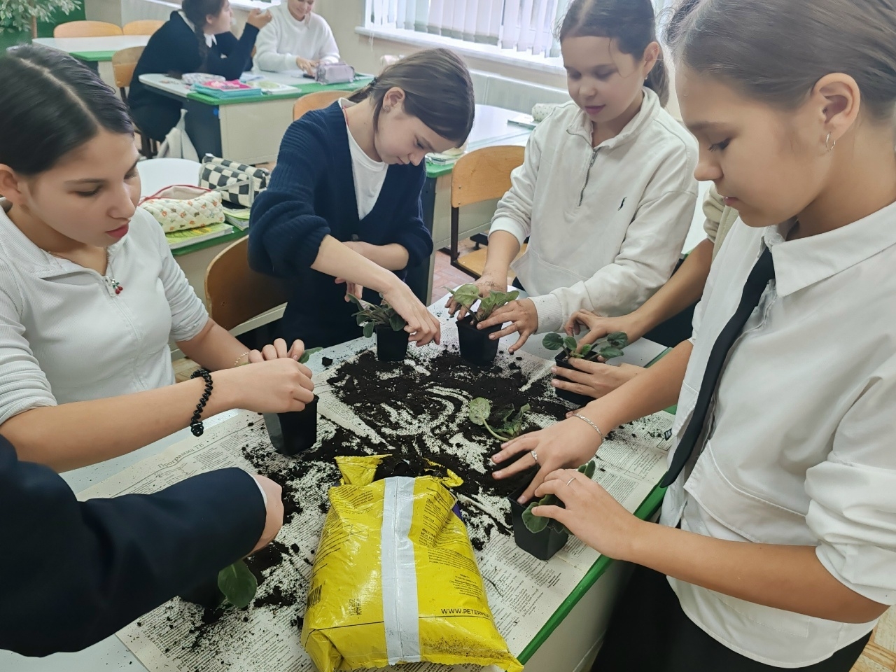 Под чутким руководством учителя биологии Харисовой О. А. ребята с увлечением осваивали метод черенкования и технику пересадки фиалок. Этот практический опыт позволил им не только научиться размножать растения, но и углубиться в их изучение.