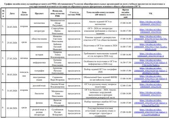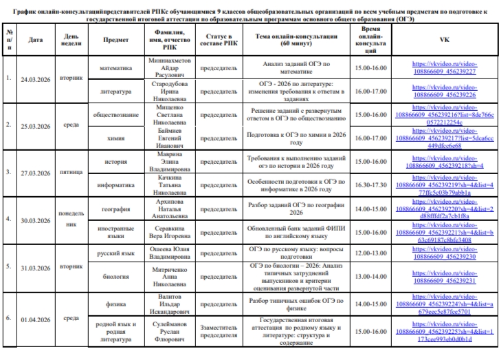 График онлайн-консультаций представителей РПК с обучающимися 9 классов общеобразовательных организаций по всем учебным предметам по подготовке к государственной итоговой аттестации по образовательным программам основного общего образования (ОГЭ) в 2026 году прикреплён ниже.