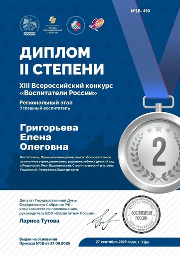 Стерлитамакский район достойно представила воспитатель детского сада села Рощинский Григорьева Елена Олеговна. В номинации «Успешный воспитатель» она заняла почетное 2 место, подтвердив свой статус успешного и инновационного педагога.